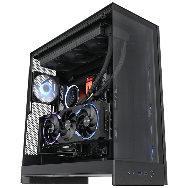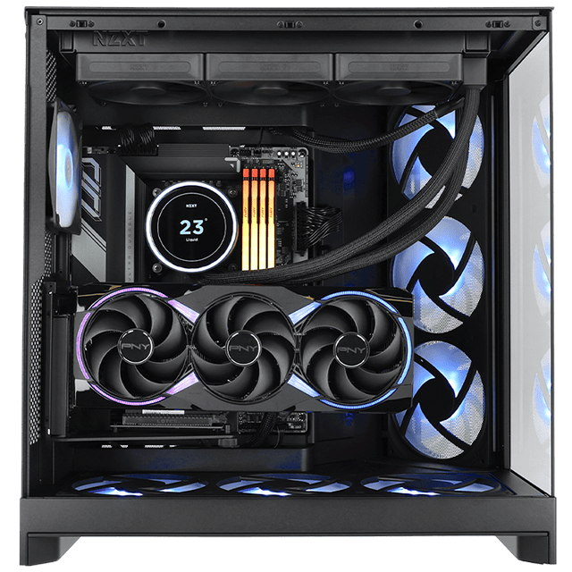 L’ensemble prend place dans un NZXT H9 Flow RGB+ Black, un boîtier d’exception combinant design moderne, flux d’air optimisé et éclairage RGB immersif. Le Kraken Elite 360 RGB Black assure un refroidissement haute performance, maintenant le processeur à température idéale dans un silence maîtrisé.