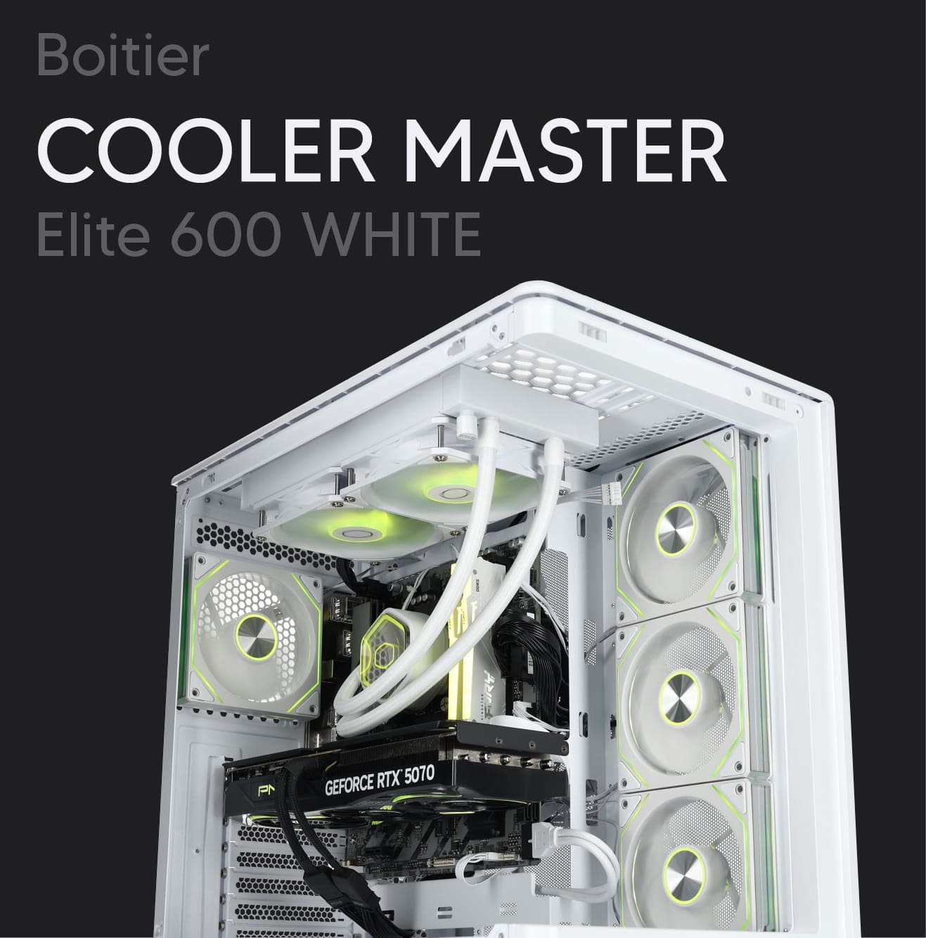 Configuration : AMD Ryzen 7 8700F, PNY GeForce RTX 5070 12GB ARGB Overclocked Triple Fan (modèle en fonction de l’arrivage), Crucial E100 NVMe 1To (modèle en fonction de l’arrivage), Kingston FURY 32Go DDR5 5600MHz (2x16Go) CL36 (modèle en fonction de l’arrivage) Gigabyte B650M D3HP, Alimentation Cooler Master MWE 750W Bronze V2, Watercooling CoolerMaster MasterLiquid 240 Core, Boîtier CoolerMaster Elite 600, Windows 11 (version d’essai).