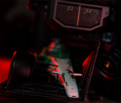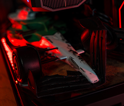 Pour Pearja, nous avons réalisé un PC sur-mesure, customisé avec la réplique d'une F1 crashée. Et pour ceux qui ne connaissent pas Pearja, disons que c’est dans ses habitudes de ne pas finir les courses...