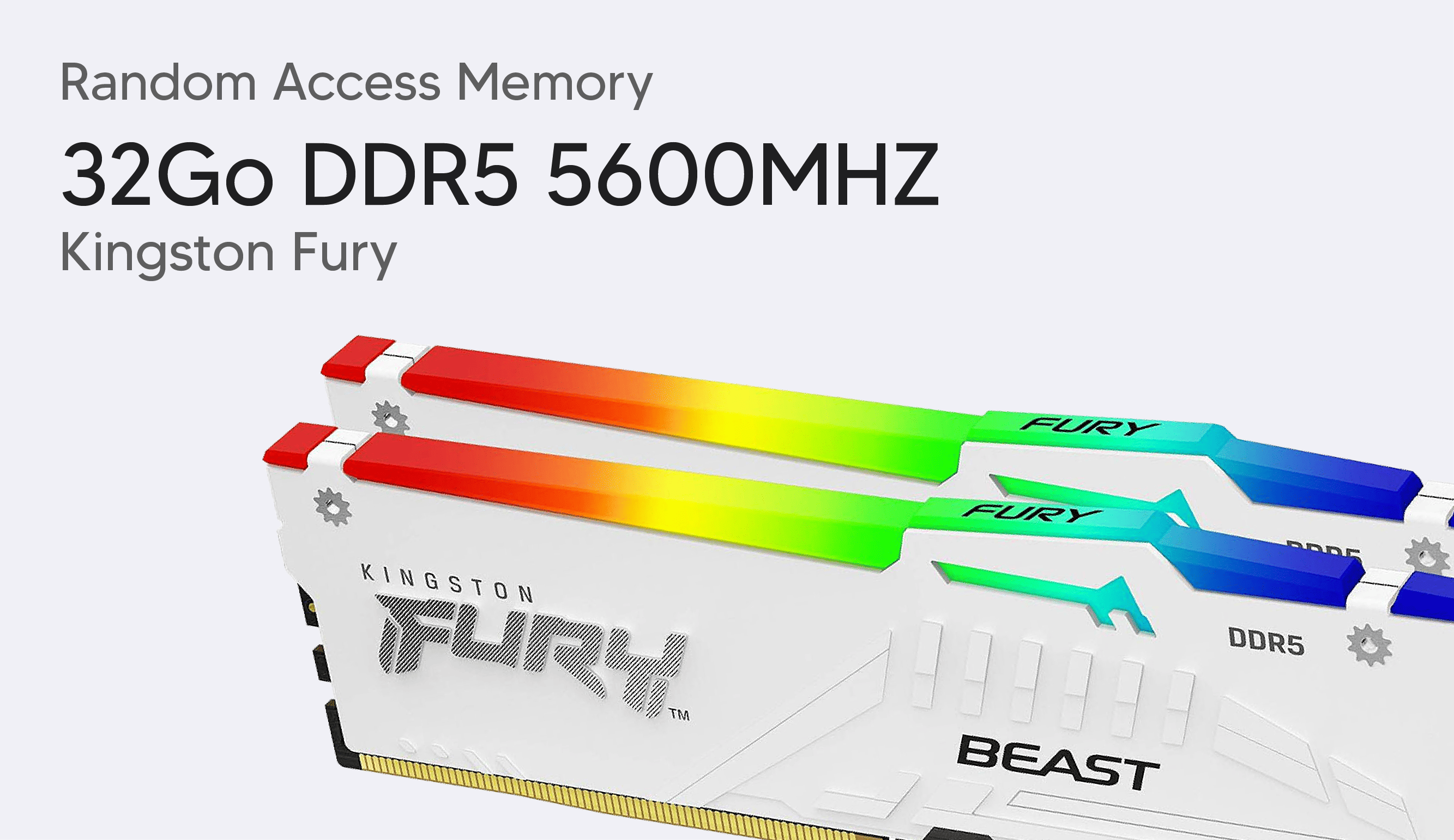 Pour garantir une excellente réactivité, ce PC embarque 32 Go de mémoire DDR5 à 5600 MHz Kingston Fury (blanc), offrant un fonctionnement ultra-fluide et un excellent confort d’utilisation en jeu comme en multitâche. Cette mémoire rapide permet d’exploiter pleinement les performances du système et assure une stabilité optimale, même sur les usages les plus exigeants.