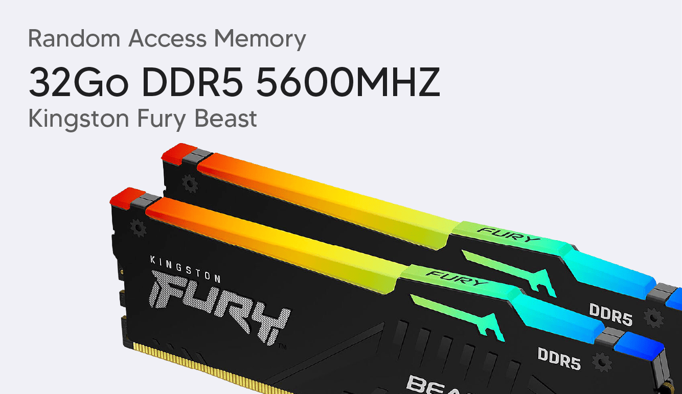 Les 32 Go de mémoire DDR5 à 5600 MHz garantissent une réactivité optimale, aussi bien en jeu qu’en multitâche. Le SSD NVMe de 1 To permet des démarrages rapides, des chargements quasi instantanés et un confort d’utilisation au quotidien.