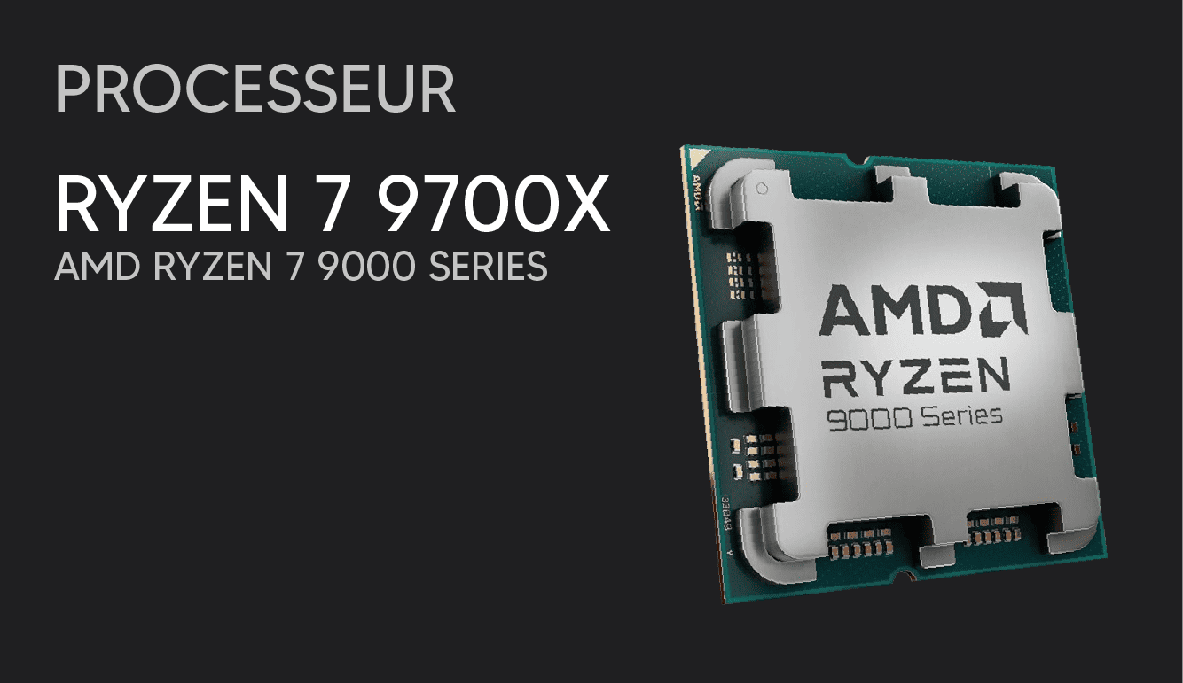 AMD Ryzen 7 9700X, Gigabyte GeForce RTX 5070 Ti, Kignston Fury 32 Go DDR5 5600 MHz, Gigabyte B650 Eagle AX, SSD NVMe Crucial E100 1 To, watercooling DeepCool LT 360, alimentation Gigabyte 850GM 80+ Gold, boîtier Phanteks Evolv X2 Matrix, Windows 11 (version d’essai).