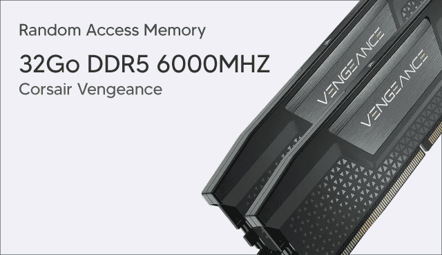 Les 32 Go de mémoire DDR5 à 6000 MHz garantissent une réactivité optimale, aussi bien en jeu qu’en multitâche. Le SSD NVMe de 1 To permet des démarrages rapides, des chargements quasi instantanés et un excellent confort d’utilisation au quotidien.